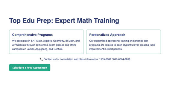 저희 탑에듀프렙은 온라인 Zoom 수업과 오프라인 잠실·압구정·센텀 캠퍼스에서 SAT Math, Algebra, Geometry, IB Math, AP Calculus까지 전문적으로 지도합니다.