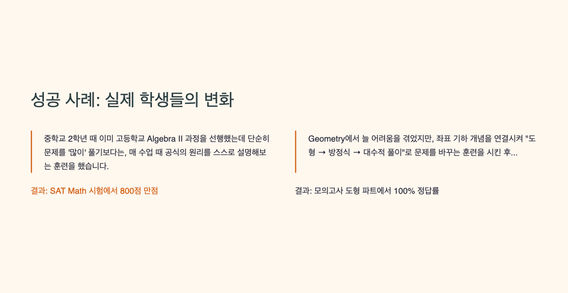 실제 잠실에서 지도한 한 고등학생은 Geometry에서 늘 어려움을 겪었지만, 좌표 기하 개념을 연결시켜 **“도형 → 방정식 → 대수적 풀이”**로 문제를 바꾸는 훈련을 시킨 후, 모의고사 도형 파트에서 100% 정답률을 유지했습니다.