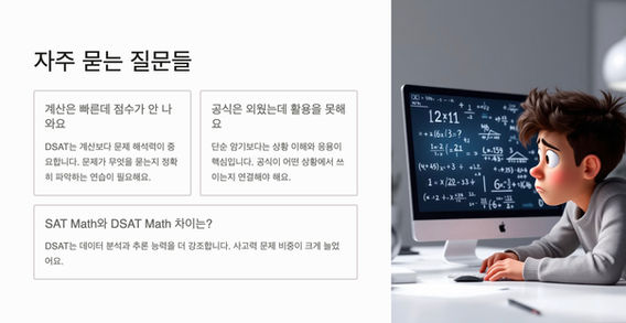 DSAT Math는 단순한 수학 시험이 아닙니다. 전략적인 학습, 실수 방지 습관, 실전 감각 훈련이 동시에 필요합니다. 이 세 가지를 모두 준비하지 않으면 아무리 수학 실력이 뛰어나도 만점은 놓칠 수 있습니다. 학부모님들께서도 자녀분이 단순히 문제집만 푸는 것이 아니라, 실제 시험과 동일한 환경에서 준비하고 있는지를 꼭 확인해 주시기 바랍니다.